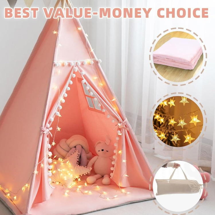 Cotton Canvas Playhouse Children Teepee Tentorium Kids with Mat.Your Ultimate Magical Play Space For Creative Adventures. Hoc Cotton Canvas Teepee Tentorium includit amoena Mat, lepidus lumina stellata, et commodius portare Casum. Perfect For Inspirating Imaginative Play And Creating Lasting Childhood Memories.