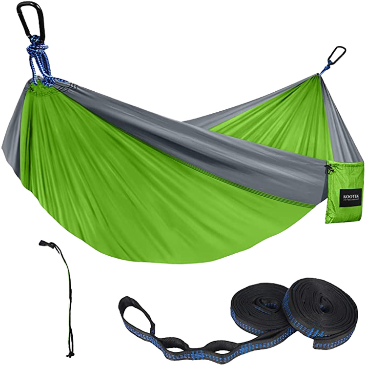Parachute-gradus nylon taffeta ab alto densitate fictus, qui eximias vires cum mollitudine componit, haec hammock superiorem consolationem et vetustatem tradit, cum fiducia ad 400 libras sustinens.